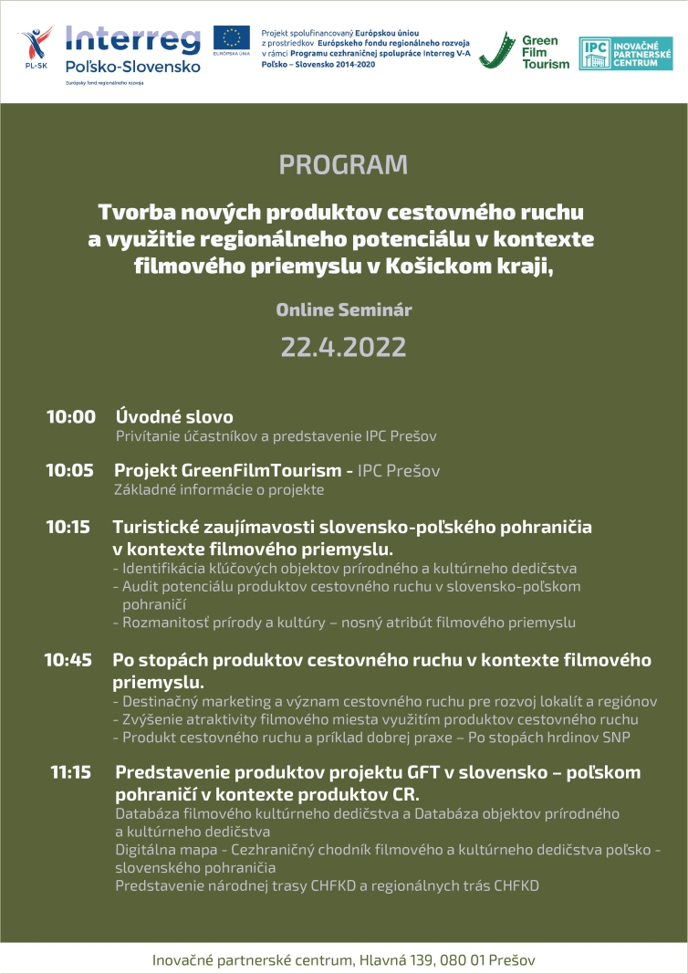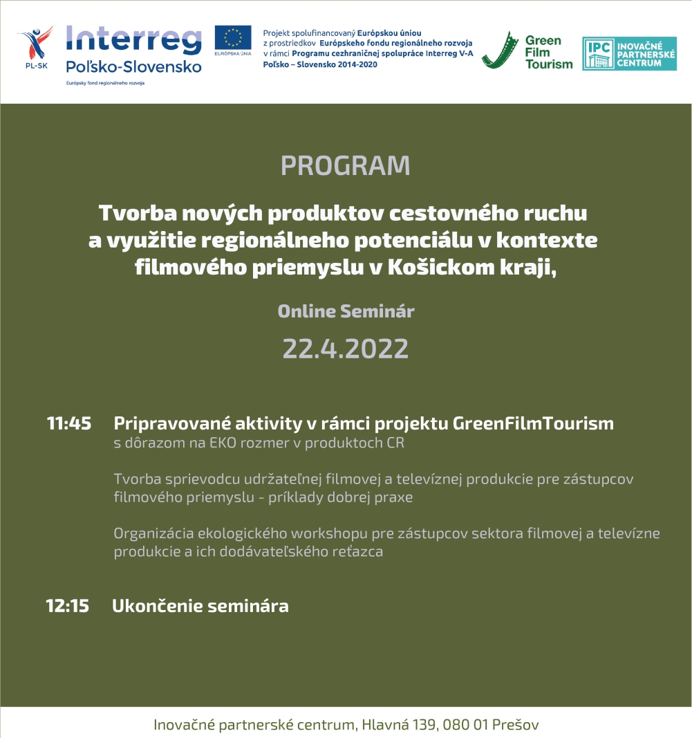 Centrum Partnerstwa Innowacji w ramach projektu GreenFilm Tourism zorganizowało seminaria online dla regionów Košice i Žilina. Seminaria dotyczyły tworzenia nowych produktów turystycznych i wykorzystania potencjału regionalnego w kontekście przemysłu filmowego w regionie. Celem warsztatów z lokalnymi interesariuszami było zlokalizowanie transgranicznych obiektów CHFKD w Regionie Koszyce i Regionie Żylina. Po warsztatach przygotowaliśmy kompleksową informację dla partnera P1, która posłużyła do opracowania analizy opcji CHFKD i identyfikacji granic CHFKD na obszarze objętym programem dla regionu Koszyc i Žiliny. Dziękujemy wszystkim uczestnikom i mamy nadzieję, że warsztaty podobały się Państwu co najmniej tak samo jak nam.