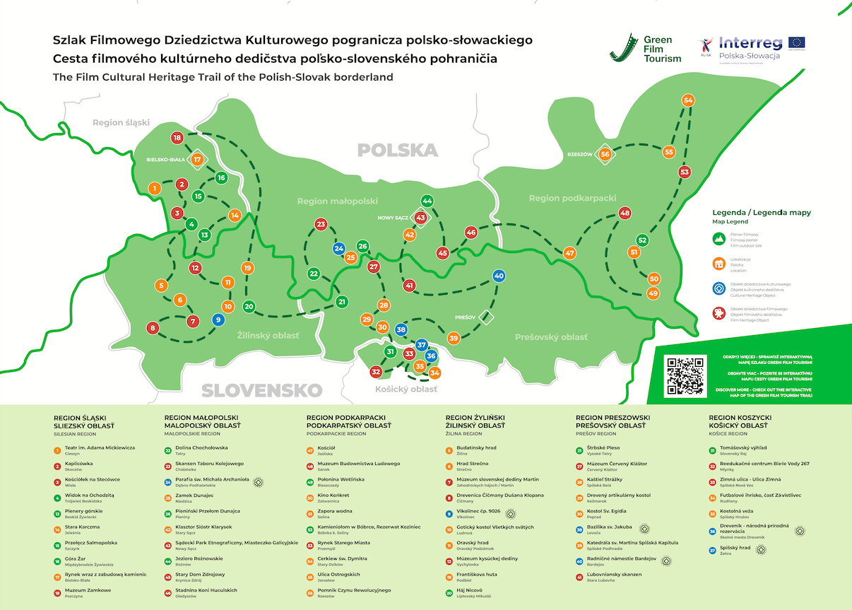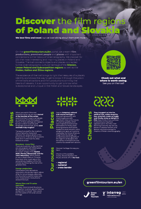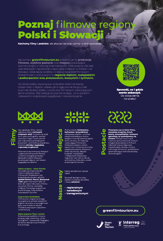 Na portalu greenfilmtourism.eu prezentujemy produkcje filmowe, wybitne postacie oraz miejsca posiadające istotne związki z historią kinematografii. Odkrywamy dla was najciekawsze i najbardziej inspirujące miejsca w Polsce i na Słowacji. Szlak łączy obiekty i miejsca związane z filmowym dziedzictwe kulturowym w regionie śląskim, małopolskim i podkarpackim oraz preszowski, koszyckim i żylińskim.